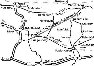 Wenn man von Berlin kommend durch Hoppegarten (liegt ungefähr da, wo die Markierung B1/5 ist) durchgefahren ist und aus dem Wald rauskommt, dann kommt man an eine Ampelkreuzung. Hier muß man rechts Richtung Fürstenwalde und Flugplatz abbiegen. Dann ca. 2 km links ist die Einfahrt zum Flugplatz - hinter Fürstenwalder Chaussee 21. Am Flugplatz 4, 15374 Eggersdorf-Siedlung !! Achtung Google-Falle !! Geben Sie "Fürstenwalder Chaussee 21, 15374 Eggersdorf-Siedlung" ein. Dann sehen Sie - bei Annäherung - auf der westl. Straßenseite das Schild "Flugplatz" in östlicher Richtung weisend. Dieser Straße folgen bis rechts Schild "Fallschirmspringen" nach rechts kommt. Dieser Flugplatzstr. folgen bis zum Packplatz der Fallschirmspringer. |